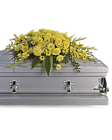 Joyous times and golden memories are recalled with this lovely half-couch casket spray that consoles the bereaved with a sunny array of beautiful blooms. An array of vivid flowers such as yellow roses, gladioli and chrysanthemums contrast with peaceful greens including Italian ruscus and aspidistra leaves. Orientation: N/A