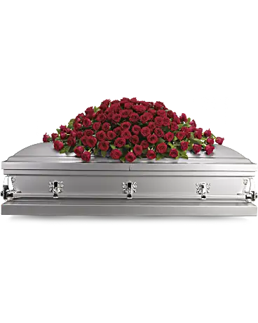 Express your love and devotion with the traditional elegance of this stunning red rose casket spray. Ideal for a full couch or closed casket service, the impressive display features a generous array of bold, beautiful blooms. Red roses are arranged with rich green salal into a classic casket spray. Orientation: One-Sided